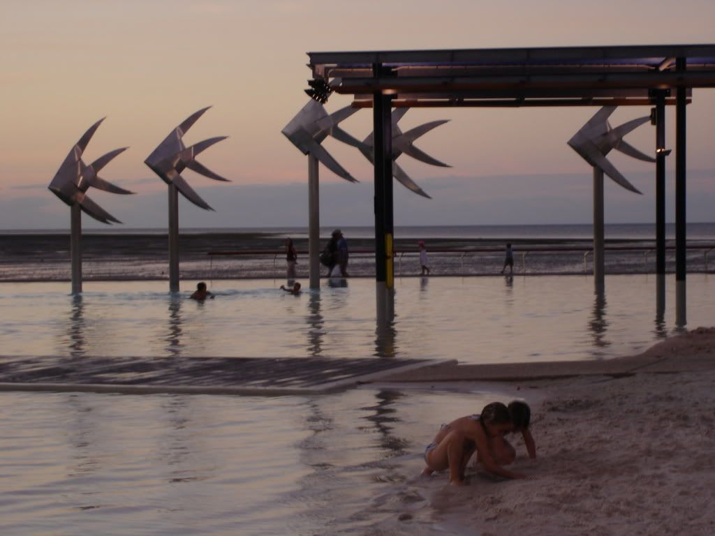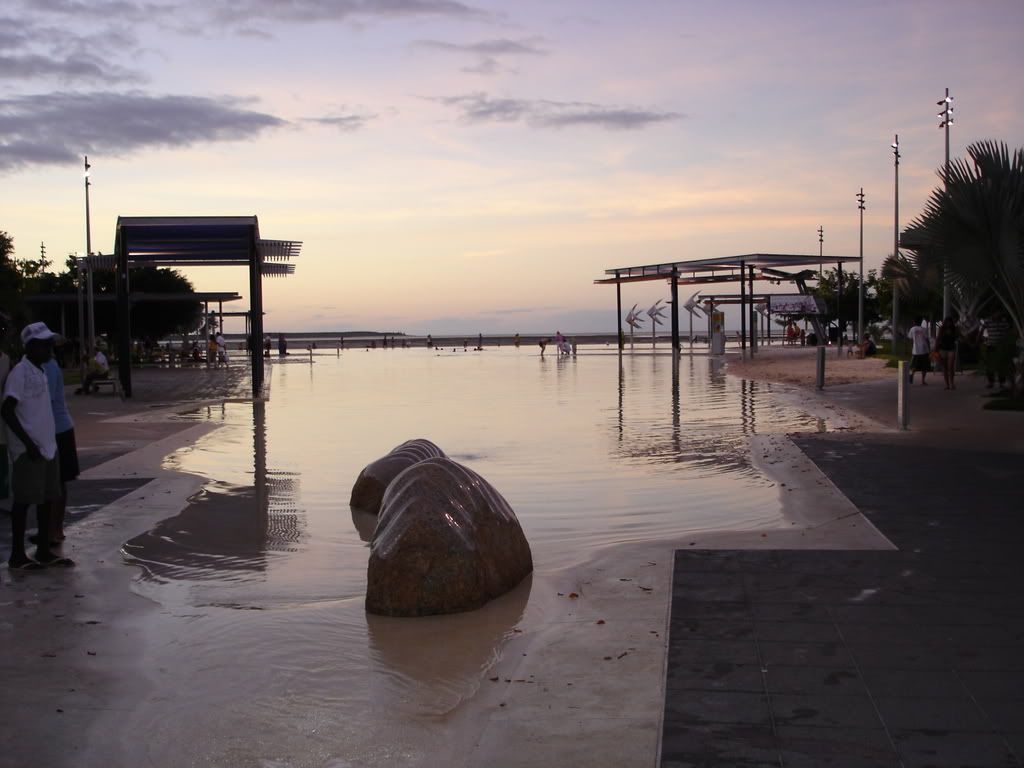 I didn’t find the sandy oasis I expected, but a boggy, crocodile-infested marsh. Fortunately, the town compensated by building an impressive, 4800-sq-m (3 mile) saltwater swimming lagoon which was lined by hundreds of scantily clad, bronzed bodies. The public BBQs were fired up, boys were tossing Frisbees and rugby balls across the lawn, and a live band filled the air with happy tunes. After an hour in the sun, I headed back to Gilligan’s to check into my room, a 6-person dorm with a private bathroom. Four of the beds were occupied, the last 2 reserved for Chelsea and myself. She wasn’t due to arrive until just before midnight, so I donned my running gear and headed back to the promenade to run along the 3km esplanade.
