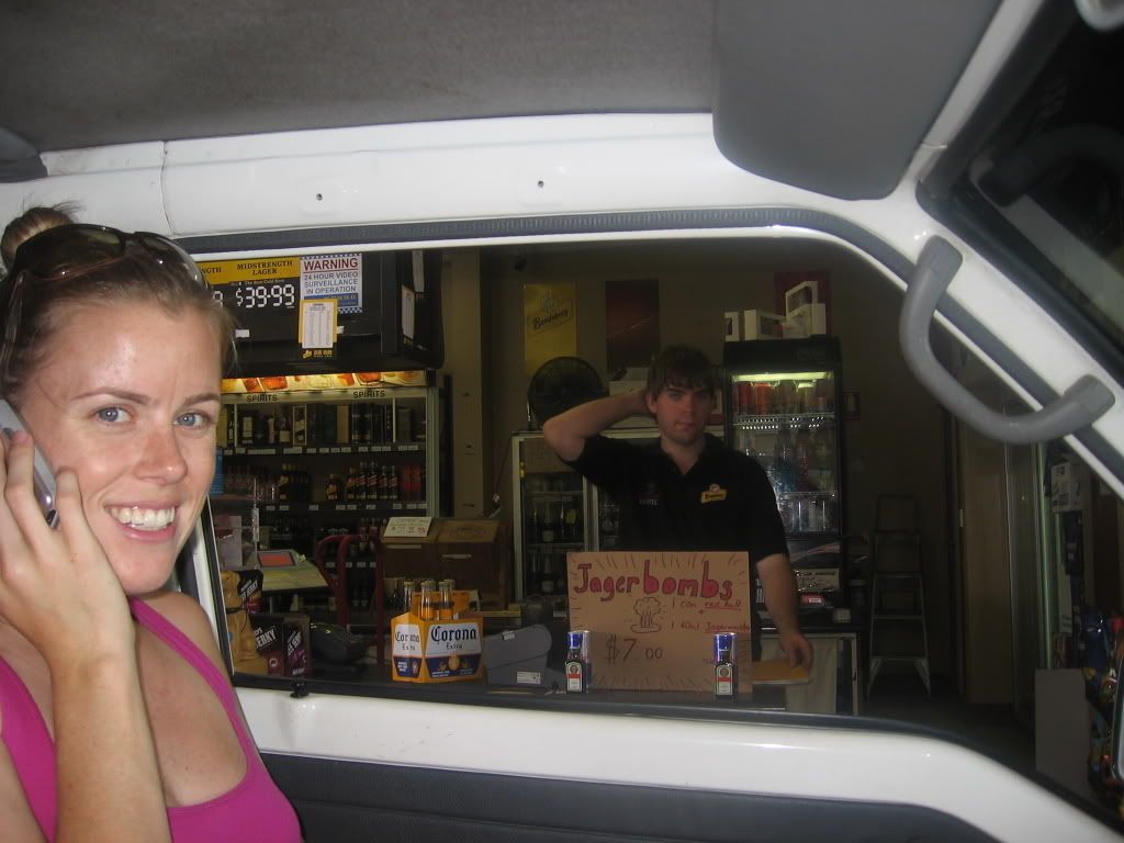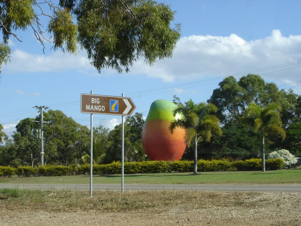 5/22 - After a quick trip to the drive-thru liquor store, we hit the highway for Arlie Beach, gateway to the Whitsunday Islands. Our first stop was the tiny town of Bowen to see one of Australia’s giant roadside attractions, the Big Mango. We’d also heard that Nicole Kidman and Hugh Jackman were here filming the epic period piece, "Australia." We parked the van in the center of the quaint little town and joined a crowd of tourists watching several frantic crew members running around trying to placate hundreds of confused cattle. Nicole was there, mounted on horseback in a long sleeve rancher’s shirt, wide-brimmed hat and riding pants, seemingly melting in the hot sun. We were also melting, and bored, so we got back in the van and headed towards the mango. The large orange blob was perched on the side of the higway, representing Bowen’s thriving fruit and vegetable center. We made some sandwiches, cut up some lime for our Coronas, and crossed the road to the beach for a picnic in the sand.