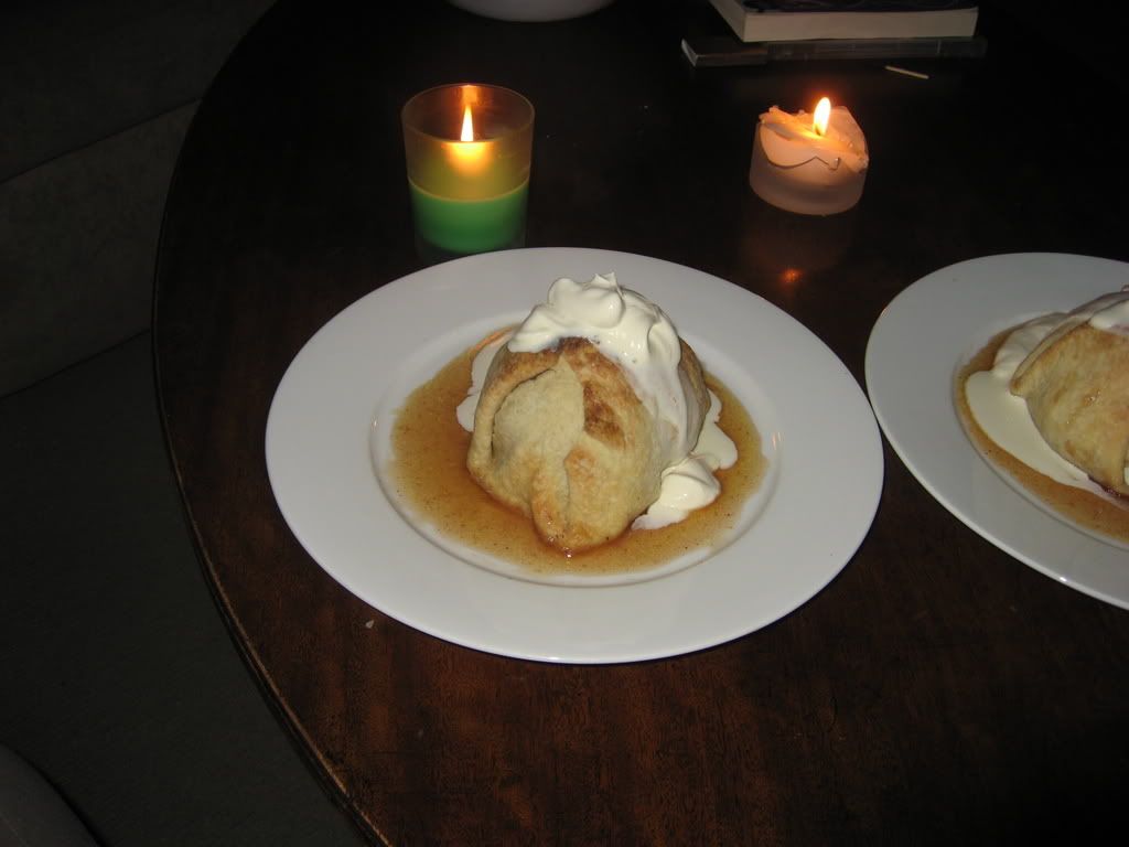 Nevertheless, the results have been delicious. Here is a recipe from yesterday's efforts, apple dumplings with homemade whipped cream and cinnamon syrup. Yum. . .